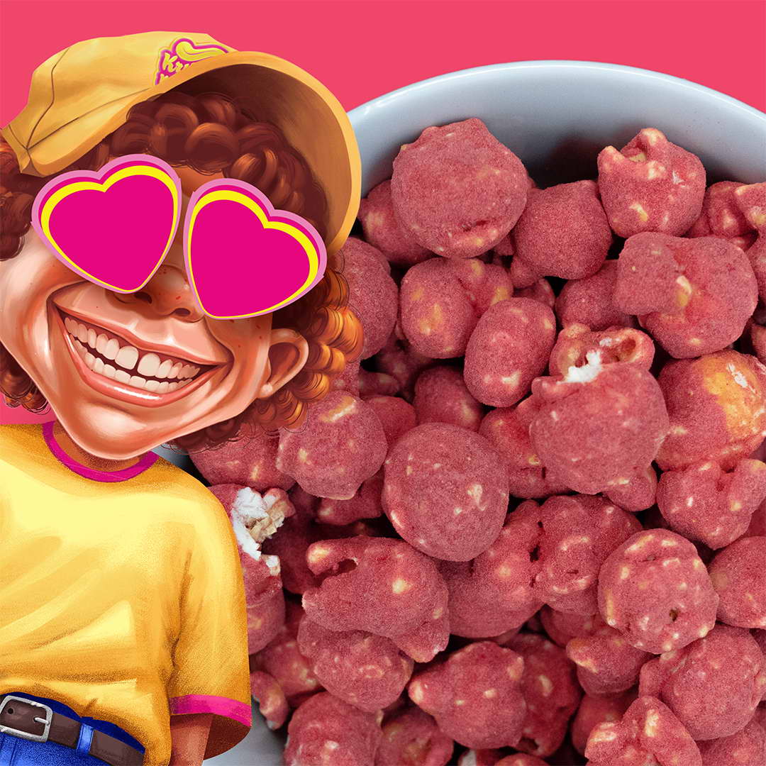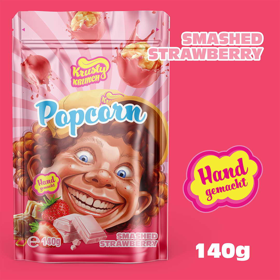 Karamelizirane kokice Krusty Krunch, oblite z nežno rožnato jagodno čokolado in posute z zdrobljenimi jagodami – vsak grižljaj te v trenutku popelje v pravo jagodno deželo sanj.