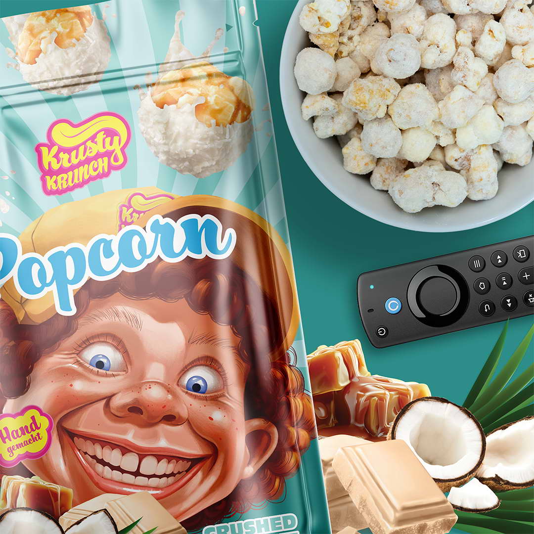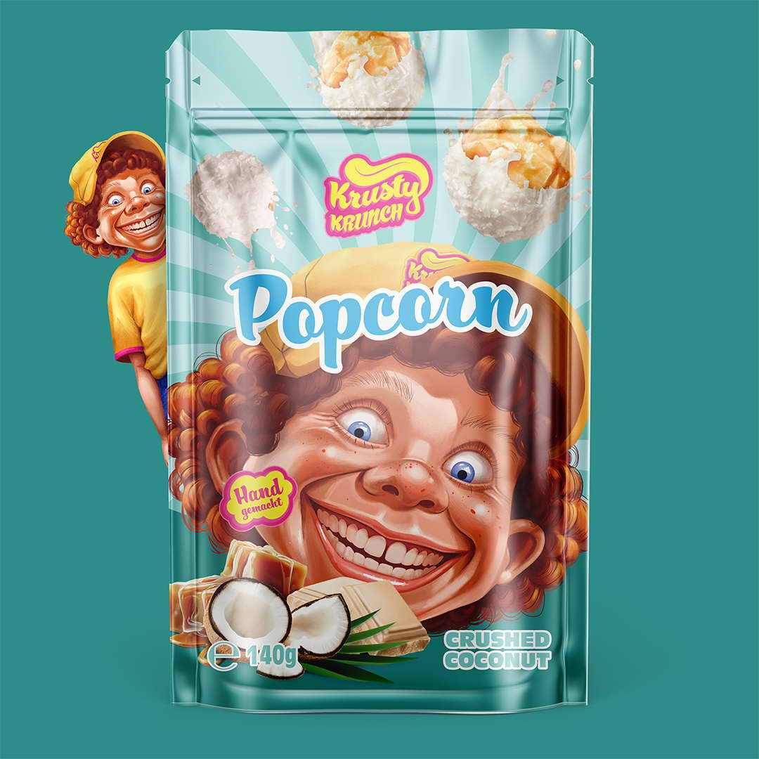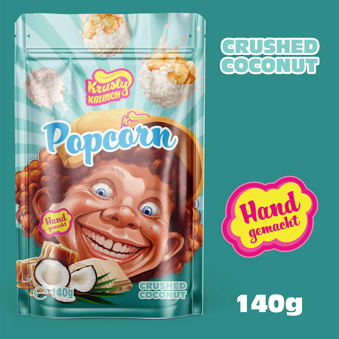 Karamelizirane kokice Krusty Krunch, oblite z nežno belo čokolado in radodarno posute z drobljenim kokosom – tako mamljive, da se tvoj kavč spremeni v peščeno plažo s šumom valov.